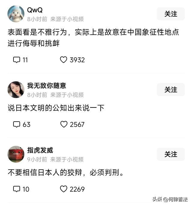 挑剔区中,不少网友纷纷吐槽:不要坚信日本东谈主的含糊,必须判刑!名义看是瞻念手脚,本色上是出奇在中国标志性所在进行侮辱和挑衅