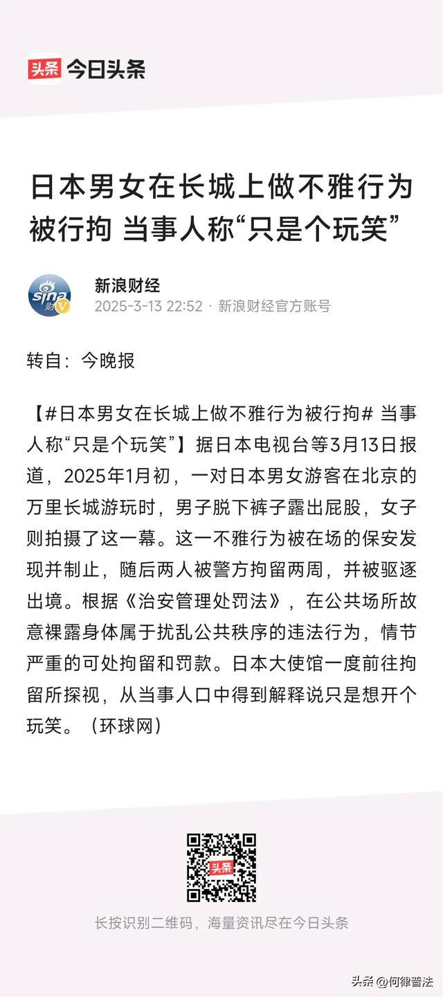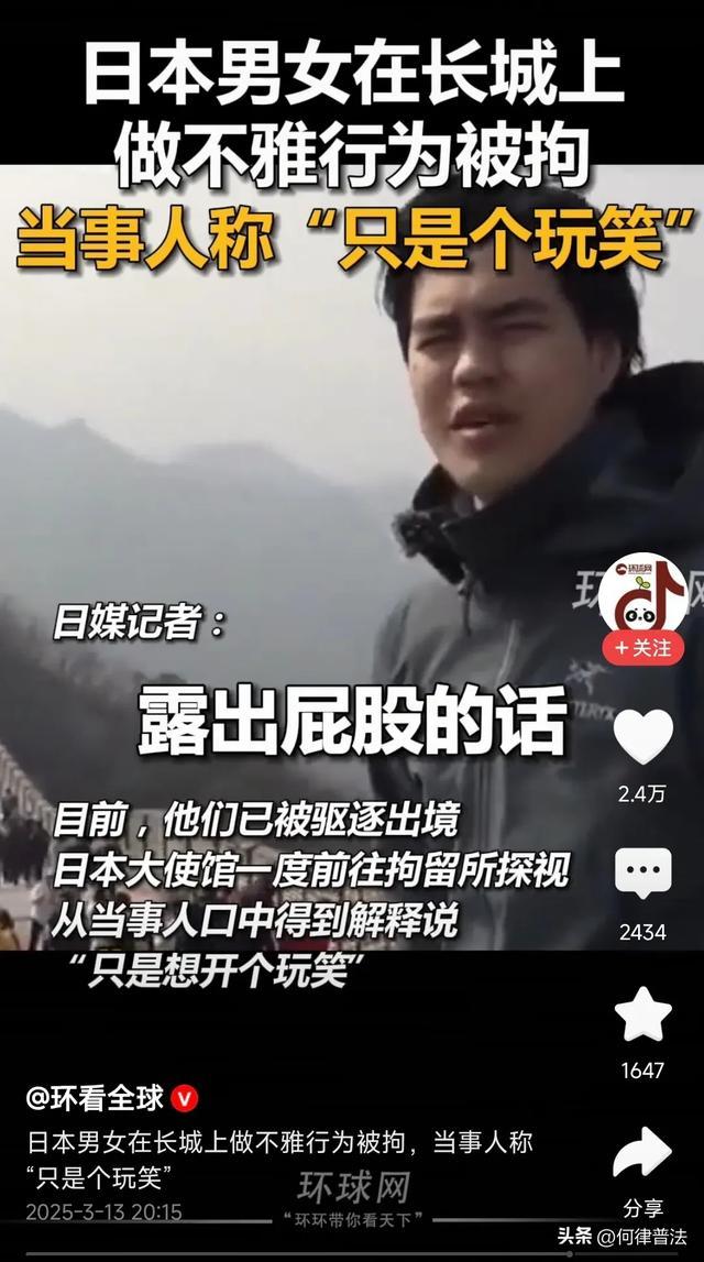 在这起事件中,两名日本籍旅客在长城这一生界文化遗产地出奇清晰臀部,属于典型的“寰宇模式出奇清晰体魄”手脚。