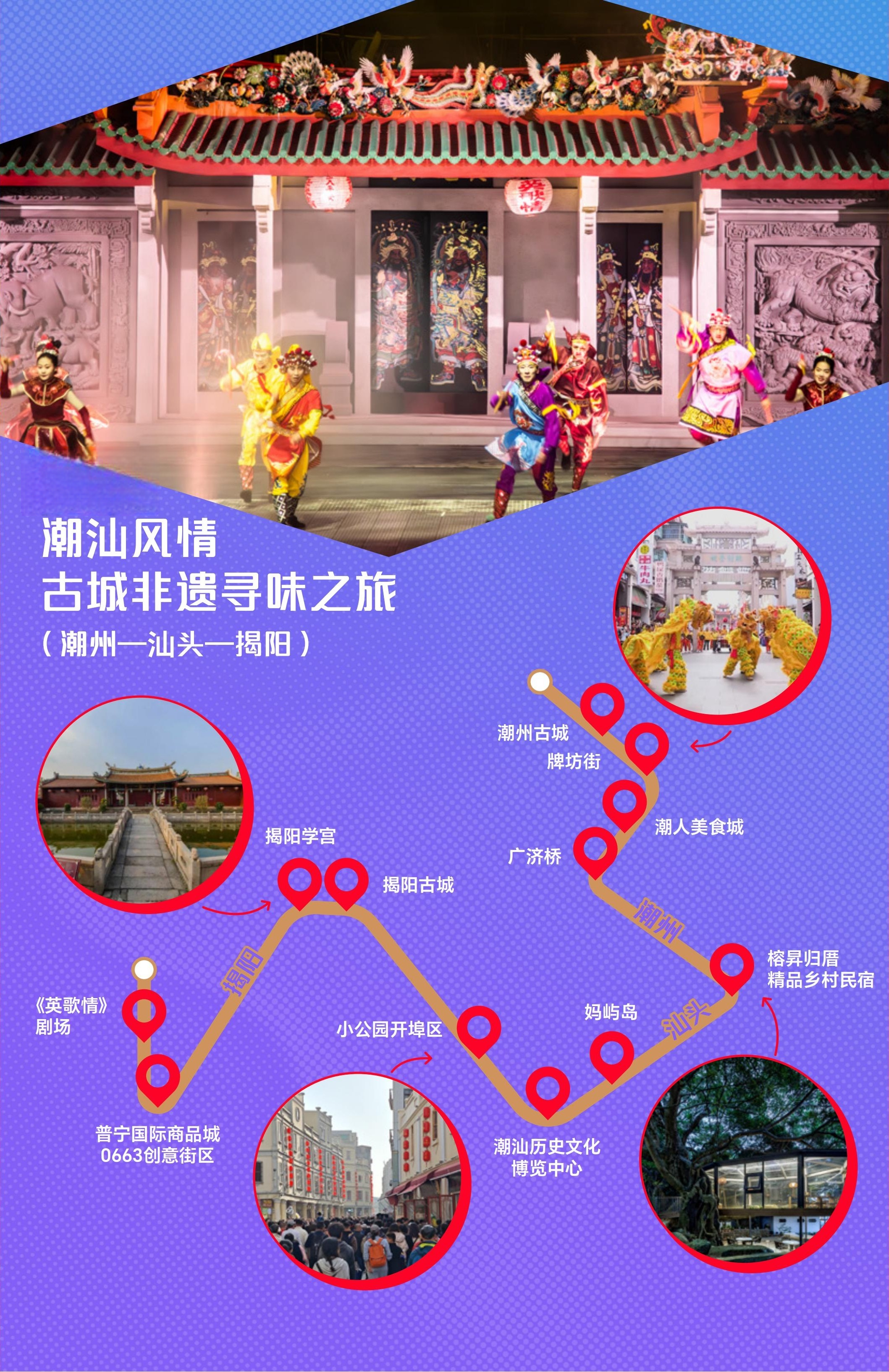 揭阳:造访揭阳古城,游览揭阳学宫;在普宁国外商品城0663创意街区感受商贸活力;夜晚体验《英歌情》戏院千里浸式精彩上演。