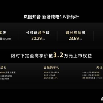 不是预售的19.69元,而是17.99万元。10月13日,对标#特斯拉Model Y#而以新奢纯电SUV定位的 #岚图知友#在杭州举行的#2024岚图用户之夜#上厚爱上市,售价17.99万元起,刷新此前对20万内纯电SUV的理解和价钱。