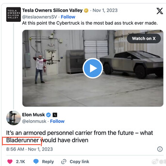 科幻电影《银翼杀手》应该是马斯克特地喜欢的一部影片,Cybertruck这款很有将来感的皮卡j9九游会官方,就曾受到这个电影启发。