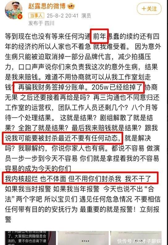 女明星被锁旅店“驱魔”、公司强扣200万补偿金、家东说念主患癌时间遭精神勒诈——当赵露念念在直播间陨涕着撕开文娱圈的遮羞布,露馅的不仅是个东说念主碰到,更是通盘这个词行业习认为常的无理法例。