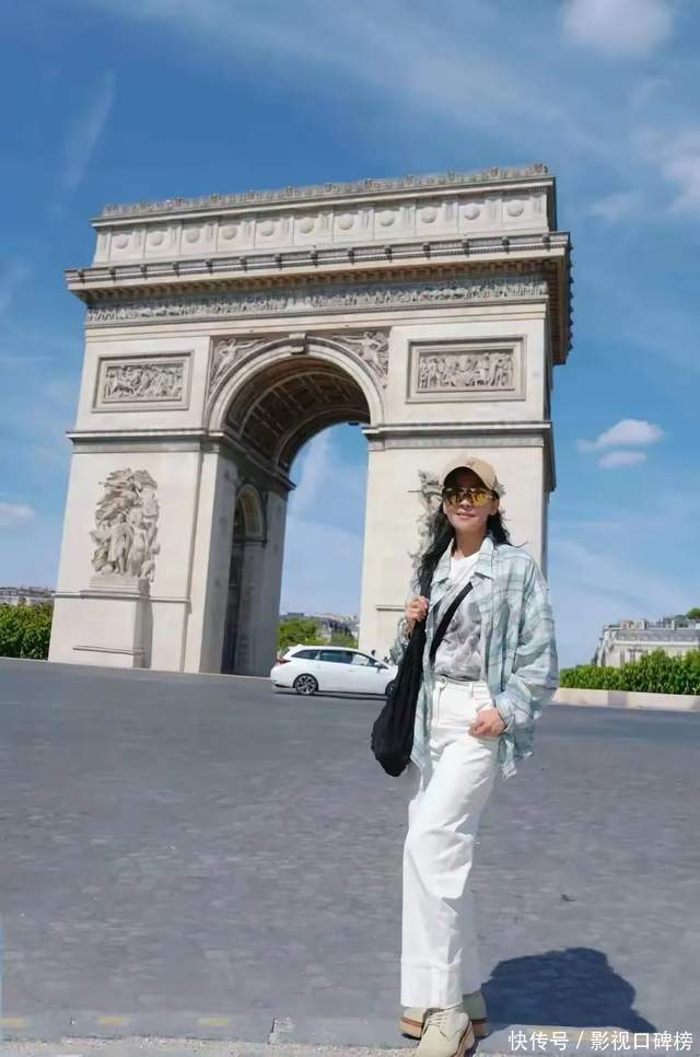 高出是她打卡巴黎埃菲尔铁塔的旅客照,穿戴一件蓝色的衬衫内搭白色印花T恤,下半身穿白色的阔腿牛仔裤,戴上墨镜和棒球帽,斜挎大背包时一扫数缓和的氛围感拉满。