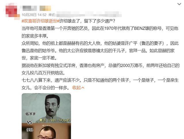 有的镜头生硬地指向那时还在病床的许绍雄,病东说念主的不幸与家东说念主的泪水,被那些东说念主不知廉耻地酿成搏流量的用具。 比如说遗产问题,有东说念主指许绍雄曾用2300万港元给男儿当嫁妆,立时便引出“争产内幕”“东床谋财”等权术论。