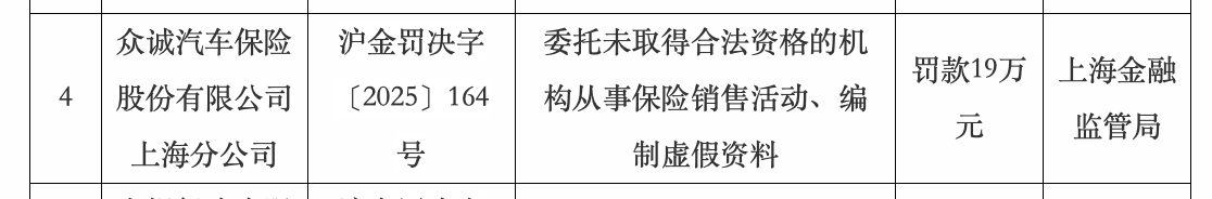 国度金融监督措置总局上海监管局9月30日败露的行政处罚信息公开表闪现,因委用未得回正当经验的机构从事保障销售举止、编制失实府上,众诚汽车保障股份有限公司上海分公司被罚金19万元。