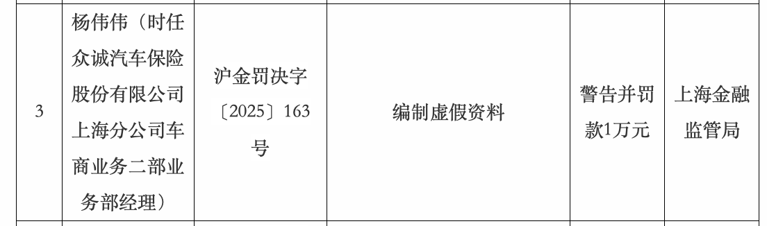 杨伟伟(时任众诚汽车保障股份有限公司上海分公司车贸易务二部业务部司理),因编制失实府上,被警告并罚金1万元。