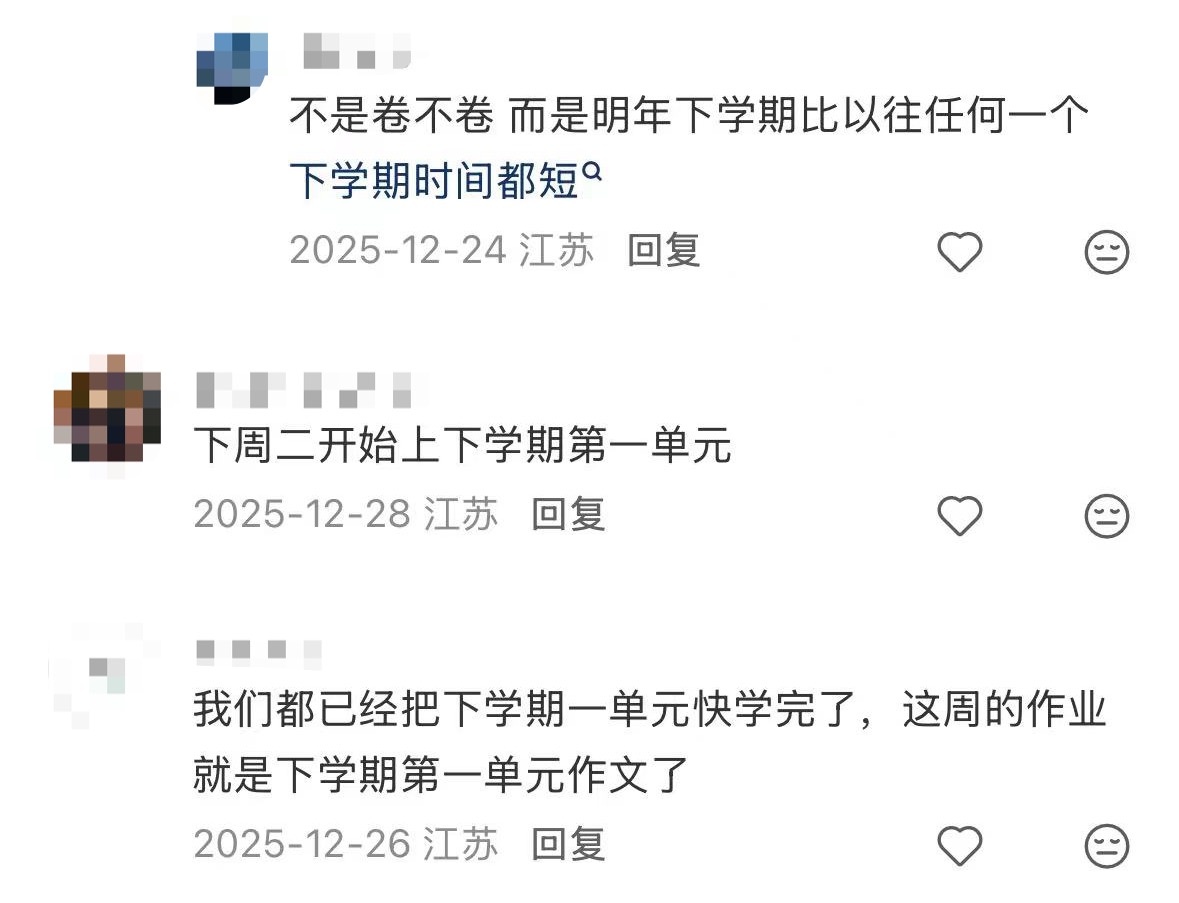 据扬子晚报报谈,为了应酬“超短”放学期,江苏也有多所学校初始提前教放学期实践。在外交媒体上,有苏州、泰州的家长均默示,我方场所的学校都也曾提前教放学期实践,底下跟帖不少。“咱们英语第二单位都快遗弃了”“语数外咱们一皆下发电子版了”“我也曾把课外训诫都买好了”……