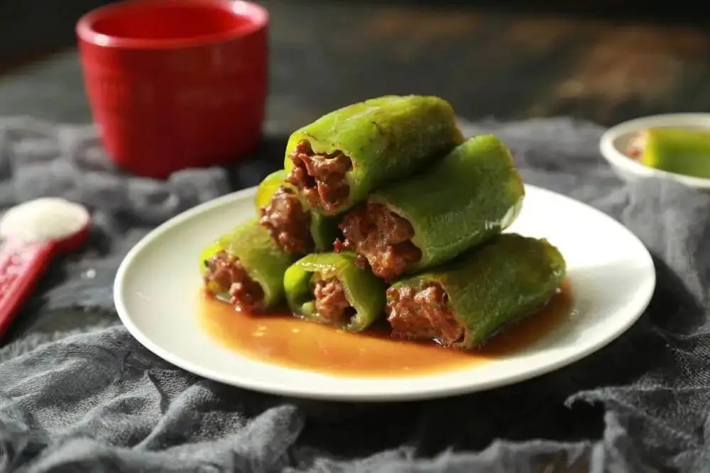 1.青尖椒3根去籽,三块钱的五花肉给它搅成肉泥,加入生抽、老抽、蚝油、精盐调味。然后把这个肉馅平直塞在青椒尖椒内部。