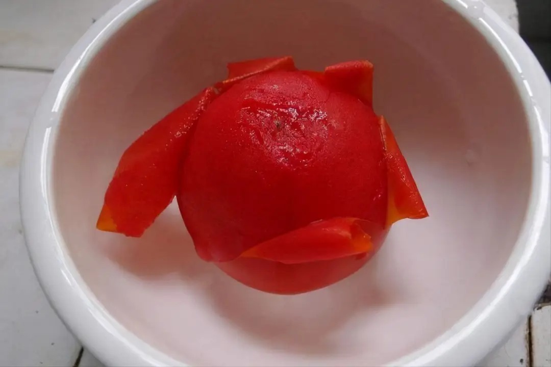 1.准备清新的西红柿一个,在顶部切一个十字花刀。然后放在热水中烫五分钟。给西红柿去皮,五分钟后捞出把它的外表撕下来。然后切成大小均匀的四方块放入碗中备用。
