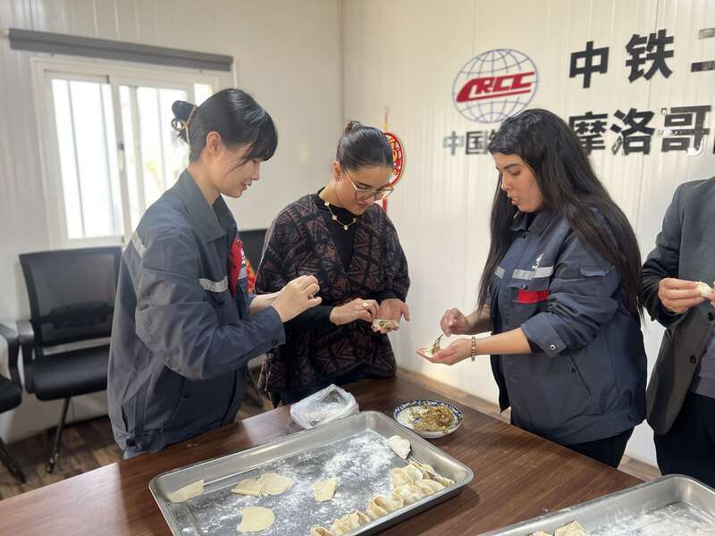 面容食堂里,年味最是浓厚。“左手托住皮儿,右手放馅别太多,从边上往中间迟缓握,劲儿匀极少才好意思瞻念。”面容办公室主任潘婷一边示范,一边耐性教当地翻译尼阿玛包饺子。面粉沾了手指,馅料偶尔溢出,尼阿玛学得异常老成,包出的饺子固然形态辞别,但每一个都透着“悉心”。案板上,一滑排饺子整皆陈列,中摩后生职工围坐一堂,揉面声、鼎沸声交汇成国外职工心里最暖的年味儿。