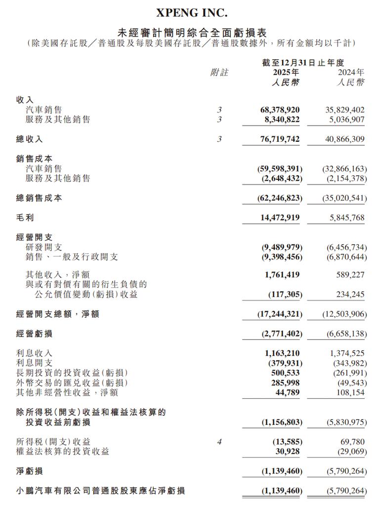 净亏空方面,其 2025 年全年净亏空为东谈主民币 11.4 亿元,2024 年这一数字为 57.9 亿元。2025 年非公认司帐原则小鹏汽车往常股股东应占净亏空为东谈主民币 4.6 亿元,相较 2024 年的 55.5 亿元大幅减亏。