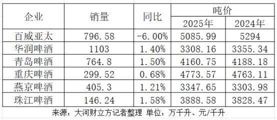 2025年度,华润啤酒、百威亚太、青岛啤酒、燕京啤酒、重庆啤酒、珠江啤酒的销量别离为1103万千升、796.58万千升、765万千升、405.3万千升、299.52万千升、146.24万千升。除百威亚太外,其他企业销量均有微增。